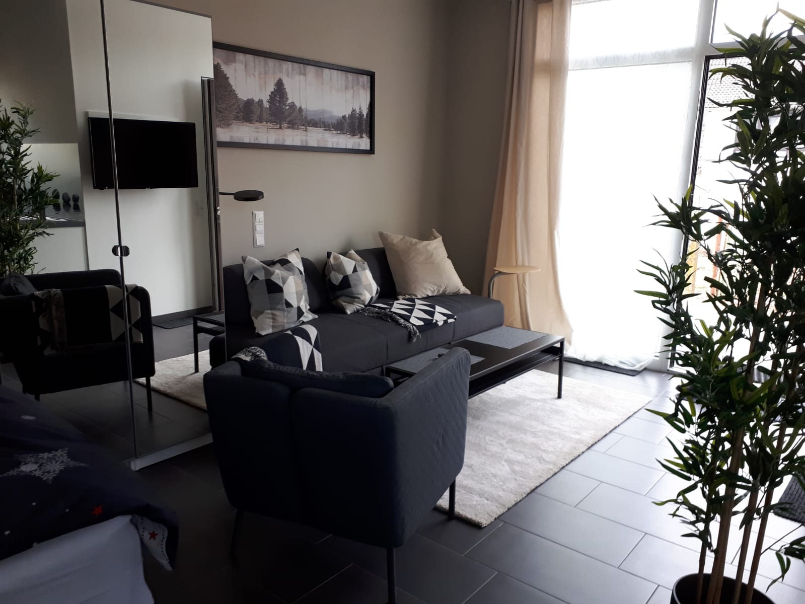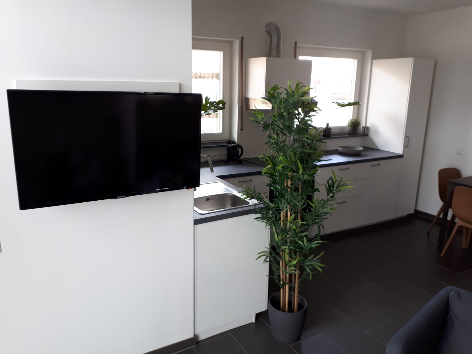 In addition to a TV, the apartment also has a PC workstation and WiFi.